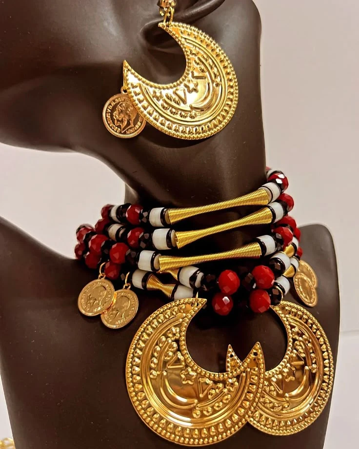 أكملي إطلالتكِ التراثية بلمسة من الفخامة مع هذا الطقم المستوحى من الفن السوداني العريق. يتكون الطقم من قلادة عريضة (عقد) مشغولة بخرز السكسك بألوانه الجذابة (الأسود، الأحمر، والأبيض) مع فواصل ذهبية مخروطية وعملات معدنية متدلية. يكتمل الطقم بأقراط كبيرة الحجم على شكل هلال محفور بدقة ومزين بعملة معدنية، ليمنحكِ مظهراً ملكياً في الجرتق والمناسبات التقليدية الخاصة
