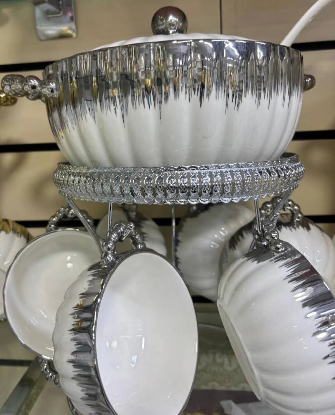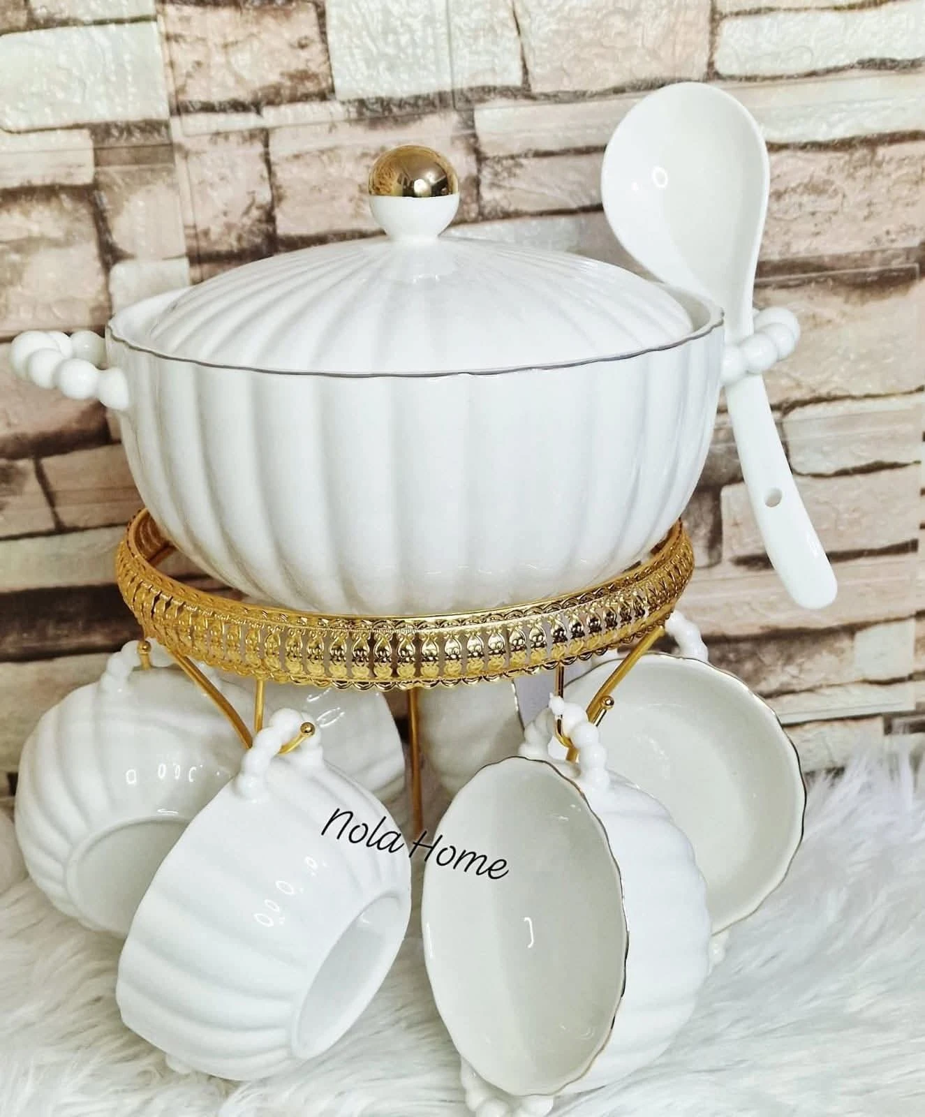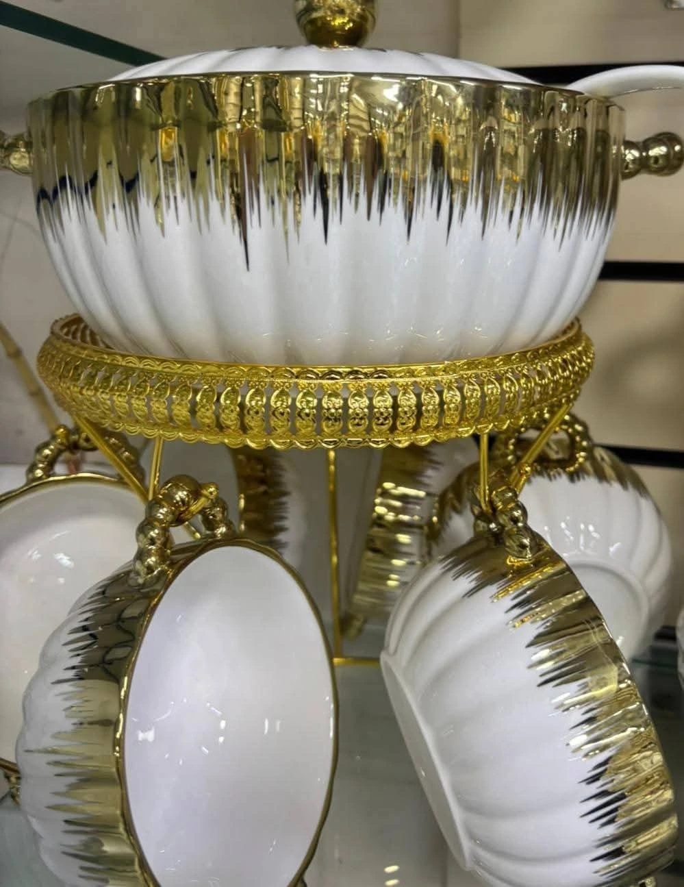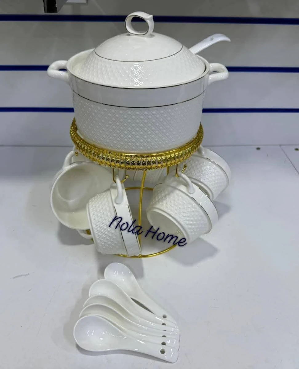 طقم ضيافة استثنائي مصمم لإضافة لمسة من الفخامة على مائدتك. يتميز بتصميم مضلع باللون الأبيض النقي مع حواف وتفاصيل ذهبية براقة توحي بالرقي. يتكون الطقم من وعاء كبير بغطاء لتقديم الشوربة أو المأكولات الساخنة، مع مجموعة من الأوعية الصغيرة (البولات) المزودة بمقابض ذهبية، جميعها منظمة بعناية على حامل معدني ذهبي مزخرف. مثالي لعزومات رمضان والمناسبات العائلية الفخمة.